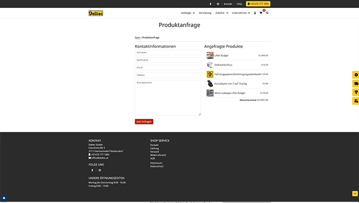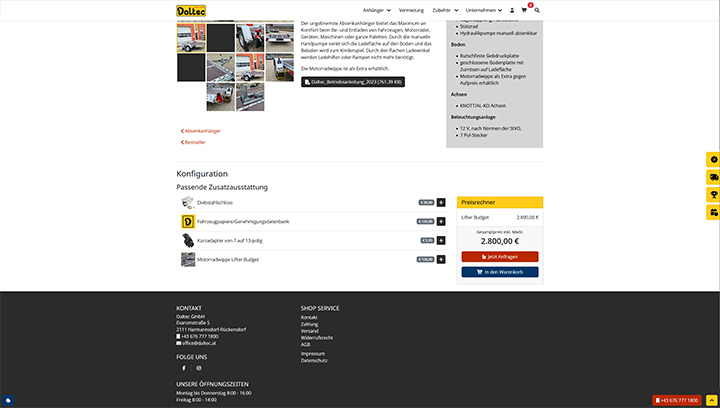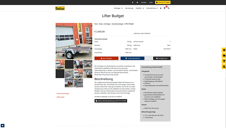 Besonders hervorzuheben ist, wie Daltec das umfangreiche und vielfältig konfigurierbare Produktsortiment technisch umsetzt: Der Online-Shop unterstützt sowohl Standardprodukte als auch individuell konfigurierbare Anhänger- oder Fahrzeugtypen – dies erlaubt dem Unternehmen, eine große Variantenvielfalt effizient zu managen. Durch ein zugrunde liegendes Shop-System wird gewährleistet, dass neue Produktvarianten, Zubehöroptionen oder Sonderlösungen zentral gepflegt werden können, ohne dass für jede Variante ein eigener Aufwand entsteht. Diese Systematik sorgt dafür, dass beispielsweise Konfigurations-Parameter wie Fahrzeuggröße, Achslast, Nutzlast, Aufbauart oder Zubehöroptionen einfach angepasst werden können, und Änderungen automatisch in den Katalog übernommen werden. So bleibt der Pflege- und Verwaltungsaufwand überschaubar, selbst wenn die Zahl der kombinierten Optionen groß ist. Zudem erleichtert das System die Aktualisierung von Lagerständen, Preisen und Ersatzteilen – ein zentraler Vorteil bei einem Sortiment, das sowohl Standard- als auch Sondermodelle umfasst. Diese technische Basis ermöglicht Darstellungen unterschiedlichster Modelle (z. B. Kipper, Tiertransport, Kühlanhänger) im Shop mit wiederverwendbaren Konfigurations-Bausteinen, wodurch sowohl Kunden eine transparente Auswahl als auch das Unternehmen eine schlanke Backend-Prozesskette erhalten. Insgesamt erlaubt die Umsetzung eine hohe Flexibilität, gleichzeitig eine einfache Pflege und Wartung des Online-Sortiments – ein entscheidender Wettbewerbsfaktor für Daltec im Bereich maßgeschneiderter Fahrzeuglösungen.