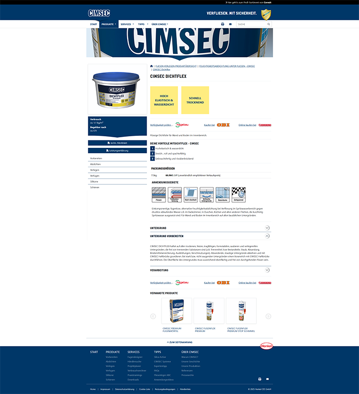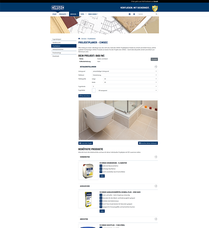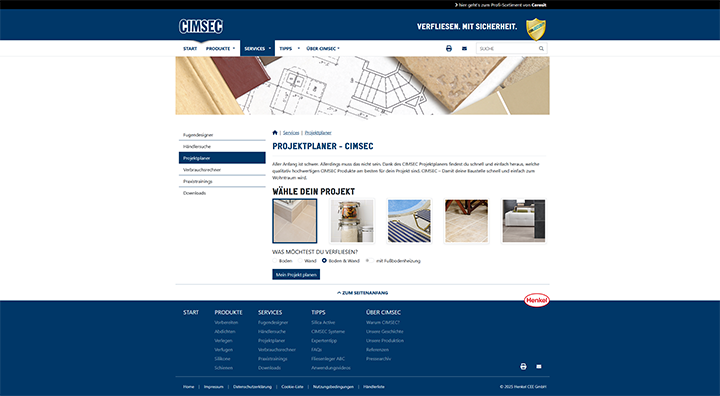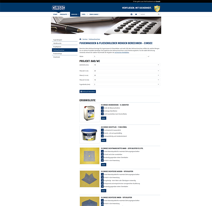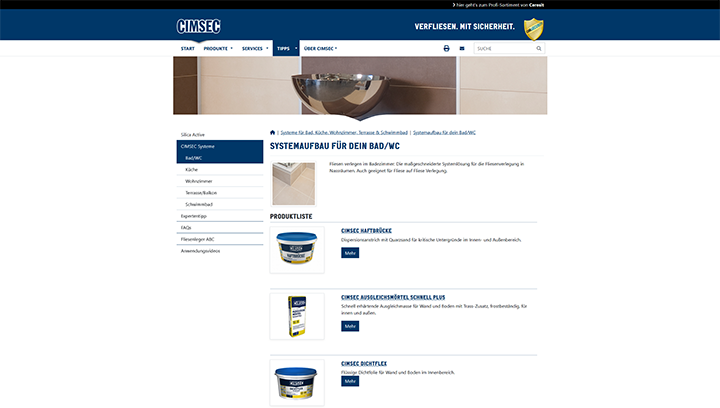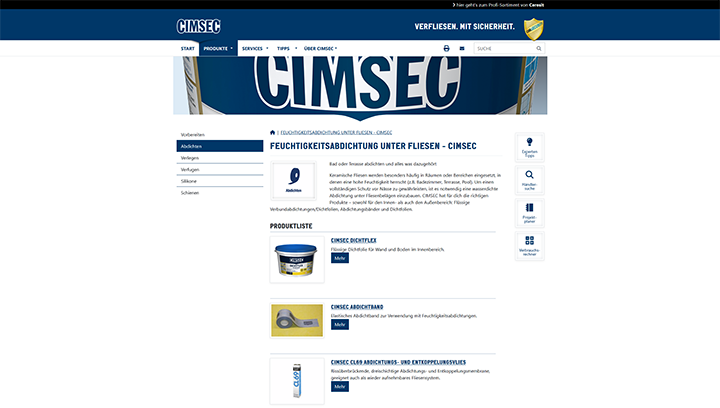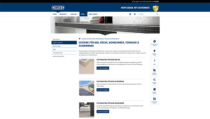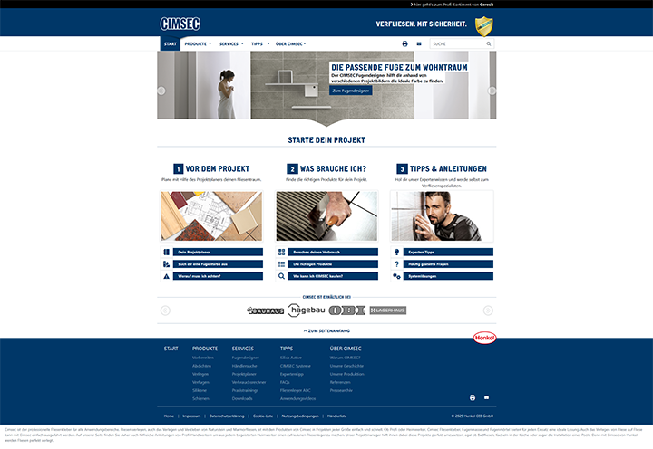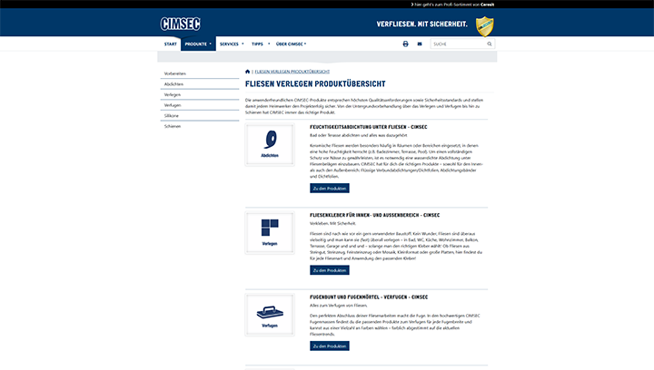 Die CIMSEC-Website bietet professionelle Unterstützung für Handwerker und Heimwerker rund um das Thema Fliesenverlegung. Mit einem umfangreichen Produktsortiment und einer Vielzahl digitaler Services setzt CIMSEC auf Innovation und Benutzerfreundlichkeit. Ein besonderes Augenmerk wurde bei der Umsetzung der Webseite auf eine einfache Pflege der Inhalte gelegt – ermöglicht durch ein leistungsstarkes Content Management System.