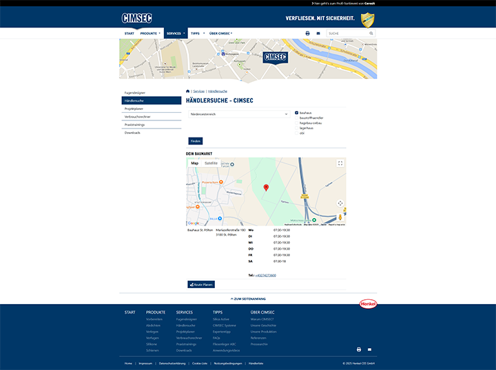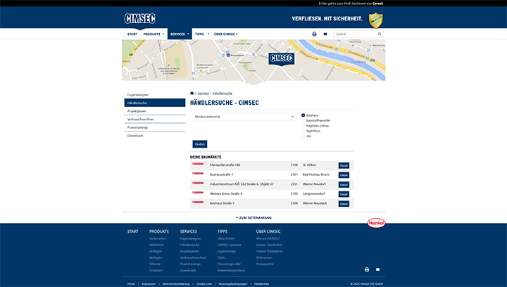 Für eine einfache Beschaffung der benötigten Produkte bietet CIMSEC eine Händlersuche mit Suchfilter. Kunden können so schnell und unkompliziert einen Vertriebspartner in ihrer Nähe finden. Darüber hinaus sorgen dynamisch erstellte PDFs mit den Ergebnislisten aus dem Projektplaner und dem Verbrauchsrechner für eine optimale Einkaufserfahrung. Diese individuell generierten Dokumente erleichtern es den Kunden, beim Händler vor Ort die richtige Menge an Produkten direkt und ohne Umwege zu erwerben.