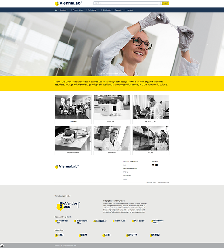 ViennaLab Diagnostics GmbH ist ein international tätiges Unternehmen mit Sitz in Wien, das sich auf die Entwicklung und Produktion von innovativen humangenetischen Diagnostiklösungen spezialisiert hat. Durch modernste Technologien und ein starkes globales Netzwerk unterstützt ViennaLab medizinische Fachkräfte bei der Durchführung präziser und zuverlässiger genetischer Tests.